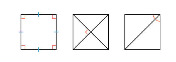 - У квадрата (как прямоугольника) все углы прямые